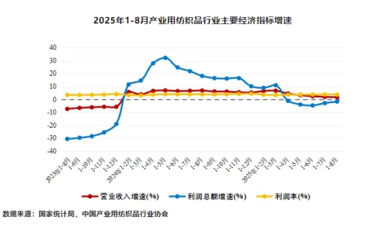 經(jīng)濟效益方面,根據(jù)國家統(tǒng)計局數(shù)據(jù),1-8月產(chǎn)業(yè)用紡織品行業(yè)規(guī)模以上企業(yè)的營業(yè)收入同比增長1.6%,利潤總額同比下降1.7%,利潤降幅連續(xù)兩個月收窄;營業(yè)利潤率為3.7%,同比下降0.1個百分點。