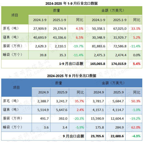 2025年前三季度,羽絨行業(yè)累計出口總額約17.4億美元,同比增長5.4%,增速與1-8月相比有所下降,整體態(tài)勢趨穩(wěn)。原毛依然是出口增長最大動力,出口額大幅增長33.1%,出口平均單價與去年同期相比上漲27.3%,量價齊升趨勢明顯。羽絨寢具出口保持穩(wěn)健增長,量值分別增長6.5%和5.2%。羽絨服裝出口繼續(xù)下滑,出口量值分別大幅下降19.7%和11.4%,出口平均單價上漲10.5%。