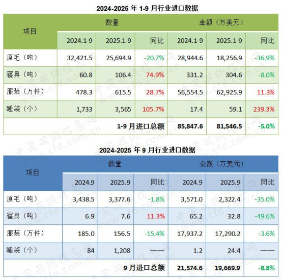 9月當月,行業(yè)進口總額約2.0億美元,同比下滑8.8%。其中,原毛進口量基本與去年同期持平,但進口額大幅降低35.0%,進口平均單價下降33.8%。服裝進口量值分別下滑15.4%、3.6%,進口平均單價上漲約14.0%。羽絨寢具進口量較少。