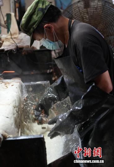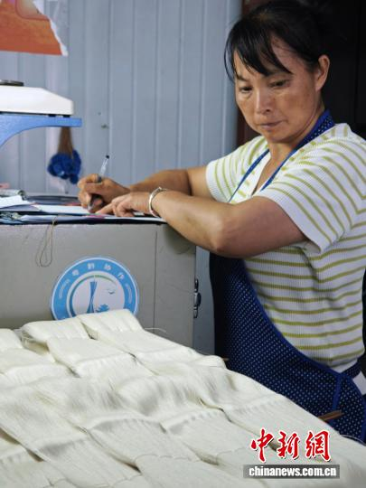 圖為10月16日,工人正在為處理好的蠶絲稱重