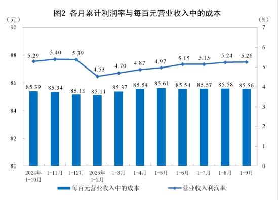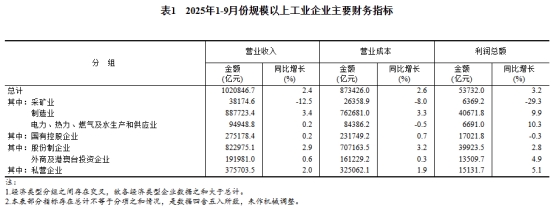 1—9月份,規(guī)模以上工業(yè)企業(yè)實(shí)現(xiàn)營業(yè)收入102.08萬億元,同比增長2.4%;發(fā)生營業(yè)成本87.34萬億元,增長2.6%;營業(yè)收入利潤率為5.26%,同比提高0.04個(gè)百分點(diǎn)。