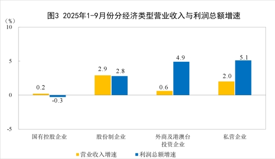 1—9月份,規(guī)模以上工業(yè)企業(yè)中,國有控股企業(yè)實(shí)現(xiàn)利潤總額17021.8億元,同比下降0.3%;股份制企業(yè)實(shí)現(xiàn)利潤總額39923.5億元,增長2.8%;外商及港澳臺(tái)投資企業(yè)實(shí)現(xiàn)利潤總額13509.7億元,增長4.9%;私營企業(yè)實(shí)現(xiàn)利潤總額15131.7億元,增長5.1%。