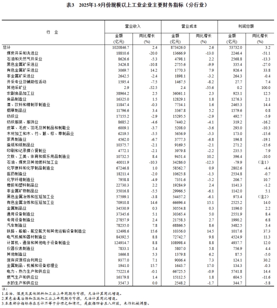 1—9月份,全國規(guī)模以上工業(yè)企業(yè)實(shí)現(xiàn)利潤總額53732.0億元,同比增長3.2%(按可比口徑計(jì)算,詳見附注二)。