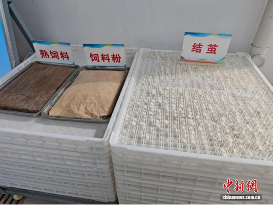 為擺脫這一困境,企業(yè)自2019年起,著手研發(fā)蠶全程飼料喂養(yǎng)與工廠化養(yǎng)殖技術(shù),最終形成一套成熟新模式。蠶從孵化后的蟻蠶到吐絲成繭的成蠶,全程采用飼料喂養(yǎng)。喂料、環(huán)境調(diào)控等環(huán)節(jié)均通過機(jī)械設(shè)備完成,養(yǎng)蠶車間溫度誤差控制在0.5℃以內(nèi),濕度誤差不超過5%,產(chǎn)出的蠶繭可直接用于繅制高檔大5A級(jí)白廠絲,從源頭保障了產(chǎn)品品質(zhì)。