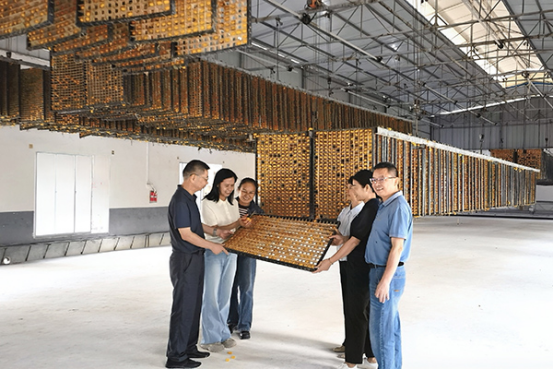 在柳城縣沖脈鎮(zhèn)春綠桑蠶專業(yè)合作社的標(biāo)準(zhǔn)化蠶房內(nèi),豐收景象惹人注目。金黃色蠶繭掛滿蠶蔟,色澤鮮亮奪目,宛如綴滿枝頭的“黃金果”?!肮鹦Q12號”是2022年通過省級審定的抗逆性天然黃繭新品種,黃繭率達到100%,其抗血液型膿病能力較傳統(tǒng)品種提升1000倍。服務(wù)組在合作社詳細了解該品種的飼養(yǎng)情況,實地開展高產(chǎn)、優(yōu)質(zhì)種養(yǎng)配套技術(shù)指導(dǎo)。