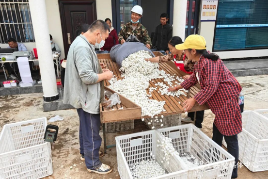 “今年你家的繭子個頭大、色澤亮,肯定能賣個好價錢?!薄澳慵业囊膊徊?,看著就扎實飽滿。”一大早,蠶農(nóng)們便肩扛裝滿蠶繭的竹筐,有序排隊等候收購,相互交流著養(yǎng)蠶心得,不時傳來陣陣贊嘆。收購現(xiàn)場,工作人員熟練地進行蠶繭品質(zhì)鑒定、等次劃分、抽樣檢測、過磅稱重、開單兌付等一系列操作,流水線式的作業(yè)高效有序,將一袋袋蠶繭轉(zhuǎn)化為蠶農(nóng)手中沉甸甸的收入,現(xiàn)場繁忙而喜慶。