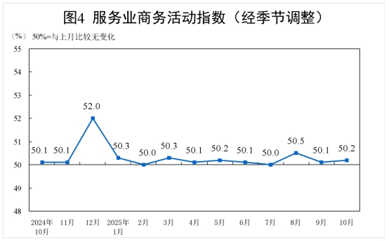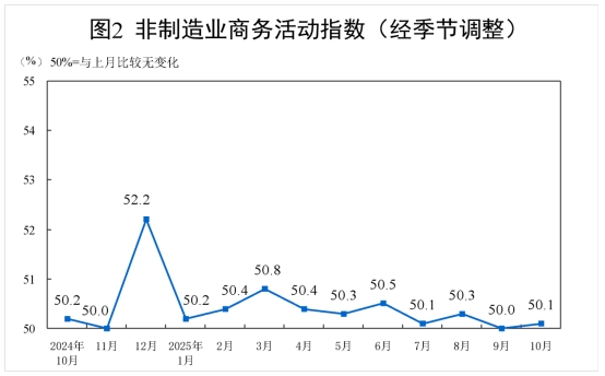 10月份,非制造業(yè)商務(wù)活動(dòng)指數(shù)為50.1%,比上月上升0.1個(gè)百分點(diǎn),升至擴(kuò)張區(qū)間。