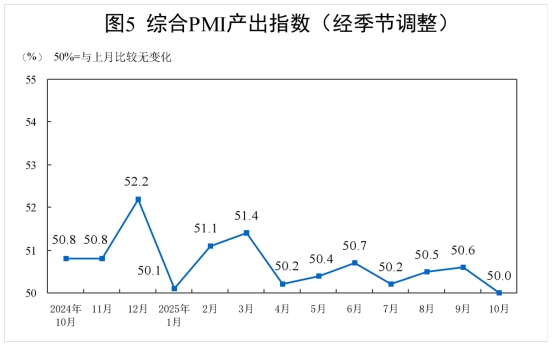 10月份,綜合PMI產(chǎn)出指數(shù)為50.0%,比上月下降0.6個(gè)百分點(diǎn),位于臨界點(diǎn),表明我國(guó)企業(yè)生產(chǎn)經(jīng)營(yíng)活動(dòng)總體穩(wěn)定。