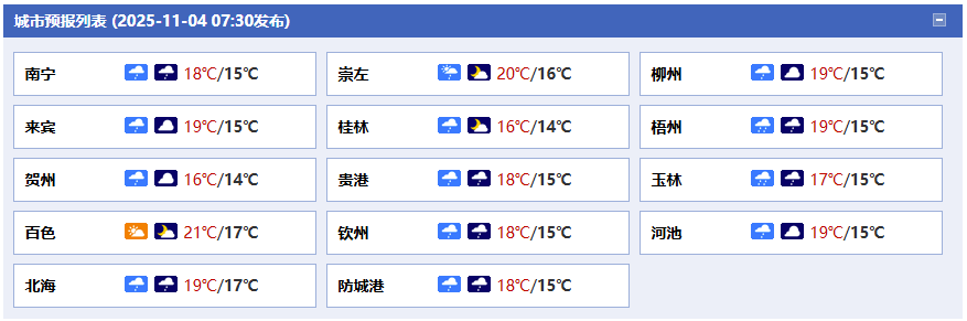 昨天到今日清晨,廣西大部被陰沉天色籠罩,涼意十足。據(jù)氣象數(shù)據(jù)顯示,4日08時(shí)前24小時(shí),全區(qū)普降小到中雨,局地出現(xiàn)大雨天氣。在雨水打壓下,氣溫繼續(xù)下降。今早08時(shí),廣西各地氣溫均跌至 “1 字開(kāi)頭”,其中南丹寒冷感尤為明顯,氣溫低至11.2℃。