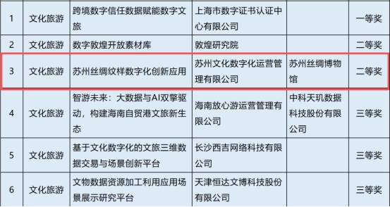 近日,2025年“數(shù)據(jù)要素×”大賽全國總決賽獲獎項目名單公示。蘇州文化數(shù)字化運營管理有限公司、蘇州絲綢博物館聯(lián)合參賽的“蘇州絲綢紋樣數(shù)字化創(chuàng)新應用”項目榮獲“文化旅游”賽道全國二等獎。作為一項全國性重要賽事,2025年“數(shù)據(jù)要素×”大賽圍繞行業(yè)領域設置13個賽道,鼓勵培育數(shù)據(jù)開發(fā)利用新模式新業(yè)態(tài)。本次大賽全國報名隊伍超過2.2萬支,共角逐出近900個項目晉級全國總決賽。在稍前進行的江蘇分賽中,“蘇州絲綢紋樣數(shù)字化創(chuàng)新應用”項目榮獲“文化旅游”賽道全省一等獎,晉級全國總決賽。