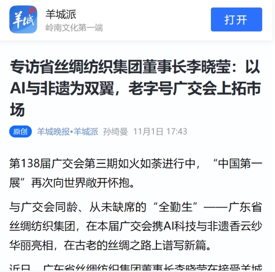 11月1日,《羊城晚報》刊發(fā)了對絲紡集團(tuán)黨委書記、董事長、總經(jīng)理李曉瑩的專訪稿,聚焦報道絲紡集團(tuán)的“廣交經(jīng)驗”。以下為報道全文: