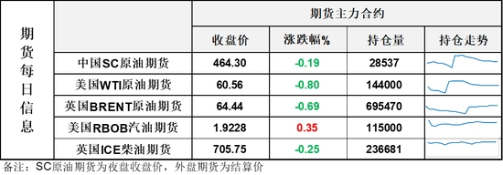 【1】WTI主力原油期貨收跌0.49美元,跌幅0.8%,報60.56美元/桶;布倫特主力原油期貨收跌0.45美元,跌幅0.69%,報64.44美元/桶;INE原油期貨收跌0.19%,報464.3元。