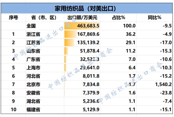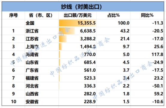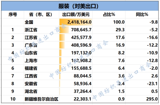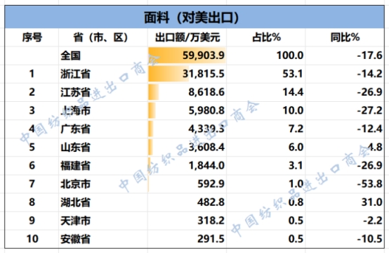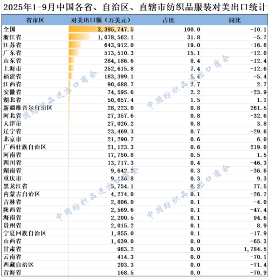 2025年1-9月我國紡織服裝重點(diǎn)省市對(duì)美出口概況