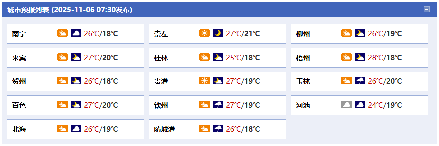 南寧市:今天白天到晚上,陰天到多云、局地有小雨,偏東風1~2級,最高氣溫26℃,最低氣溫19℃。