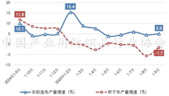 自2025年以來,我國非織造布產(chǎn)量呈現(xiàn)出“高開、回落、趨穩(wěn)”走勢,根據(jù)國家統(tǒng)計(jì)局?jǐn)?shù)據(jù),2025年1-9月規(guī)模以上企業(yè)的非織造布產(chǎn)量同比增長5%,月均產(chǎn)量較二季度提升12.2%。簾子布市場需求放緩,產(chǎn)量整體處于負(fù)增長區(qū)間,1-9月規(guī)模以上企業(yè)的簾子布產(chǎn)量同比下降1.7%(圖2)。