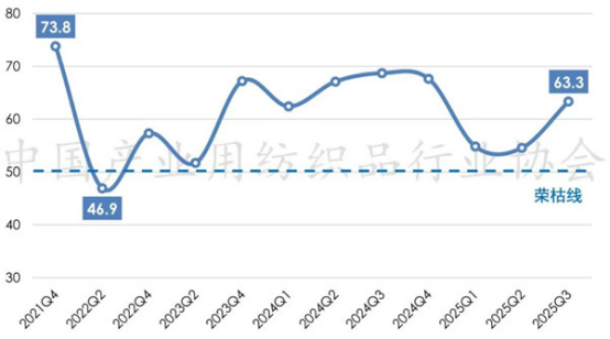2025年前三季度,全球經(jīng)濟(jì)復(fù)蘇乏力、地緣政治沖突持續(xù)、主要經(jīng)濟(jì)體貨幣政策不確定性猶存;我國經(jīng)濟(jì)運(yùn)行保持穩(wěn)中有進(jìn)態(tài)勢,高質(zhì)量發(fā)展取得積極成效。面對(duì)復(fù)雜嚴(yán)峻的外部環(huán)境,我國產(chǎn)業(yè)用紡織品行業(yè)經(jīng)濟(jì)運(yùn)行總體保持平穩(wěn),行業(yè)的生產(chǎn)、經(jīng)濟(jì)效益指標(biāo)增速有所放緩,出口呈現(xiàn)溫和回暖趨勢。根據(jù)中國產(chǎn)業(yè)用紡織品行業(yè)協(xié)會(huì)調(diào)研,2025年前三季度我國產(chǎn)業(yè)用紡織品行業(yè)景氣指數(shù)為63.3,較上半年提升8.7個(gè)點(diǎn)(圖1)。