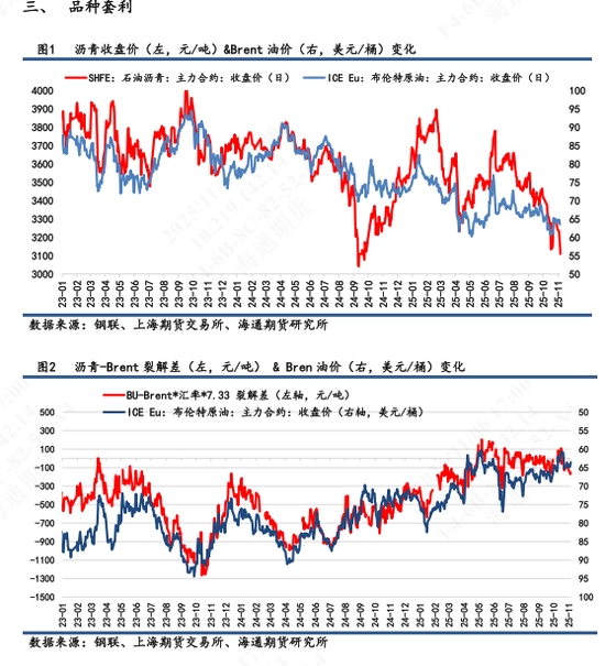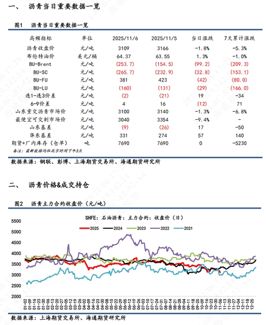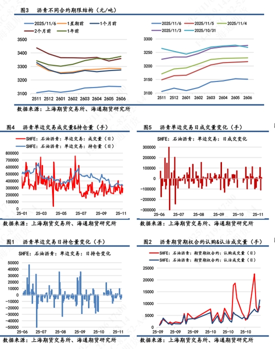 【1】盤面表現(xiàn):BU主力2601高開后回落,開盤即最高價,全天低位震蕩,最終收于3109元/噸,跌幅1.80%,自10月27日高點以來持續(xù)回落,7天累計跌幅5.3%,創(chuàng)下年內(nèi)新低。次月合約2602跌幅 2.04%,合約期限結(jié)構(gòu)呈現(xiàn)近低遠高的Contango結(jié)構(gòu),與1星期前的back結(jié)構(gòu)相反。