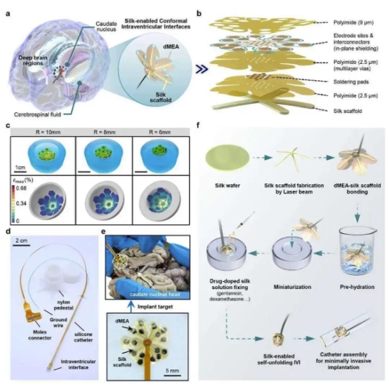 近期,中國科學(xué)院研究團隊開發(fā)出蠶絲蛋白賦能的微創(chuàng)植入式腦室內(nèi)柔性神經(jīng)界面,可在腦脊液環(huán)境中自展開,適形貼附深腦核團及腦室等大腦“內(nèi)表面”,并可長期在體監(jiān)測,為深腦核團相關(guān)神經(jīng)疾病解析提供了新的技術(shù)手段。