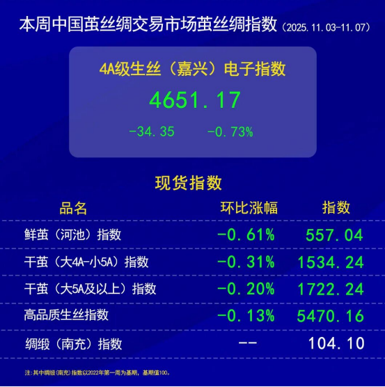 今日(2025年11月07日,周五)中國繭絲綢交易市場生絲電子指數(shù)下跌0.15%報收于4651.17點(diǎn),本周生絲指數(shù)累計下跌0.73%。B絲2022D(商檢4A級生絲):251125合約下跌0.09萬元報收于46.20萬元;260325合約下跌0.12萬元報收于46.74萬元;260925合約下跌0.06萬元報收于46.80萬元。