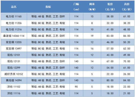 本周綢緞指數(shù)協(xié)作單位成交價格區(qū)間