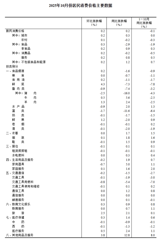 2025年10月份,全國居民消費(fèi)價(jià)格同比上漲0.2%。其中,城市上漲0.3%,農(nóng)村下降0.2%;食品價(jià)格下降2.9%,非食品價(jià)格上漲0.9%;消費(fèi)品價(jià)格下降0.2%,服務(wù)價(jià)格上漲0.8%。1—10月平均,全國居民消費(fèi)價(jià)格比上年同期下降0.1%。