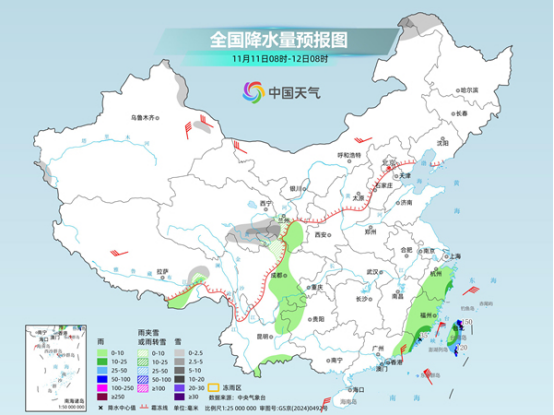 具體來(lái)看,中央氣象臺(tái)預(yù)計(jì),今天,內(nèi)蒙古東北部、黑龍江西北部、新疆北疆東北部、青海東南部、甘肅西南部、川西高原東北部等地部分地區(qū)有小到中雪或雨夾雪;廣東東南部、福建東南部、浙江東部、臺(tái)灣島大部等地部分地區(qū)有中到大雨,其中,臺(tái)灣島東北部和東南部等地部分地區(qū)有暴雨或大暴雨。