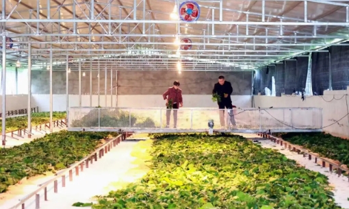 西充縣鳴龍鎮(zhèn)回龍場村僵蠶養(yǎng)殖基地,蠶房工人乘坐電動軌道喂蠶車向養(yǎng)蠶區(qū)投喂桑葉