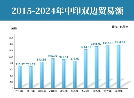 印度是中國重要的絲綢出口市場。經(jīng)歷五年的停航后,中印兩國恢復(fù)直航?;謴?fù)直航的時間點,正值廣交會和進博會的節(jié)點。中國多年保持印度第一大貿(mào)易伙伴地位。根據(jù)中方統(tǒng)計,2024 年中印雙邊貿(mào)易額為1384.78 億美元,同比增長1.7%。