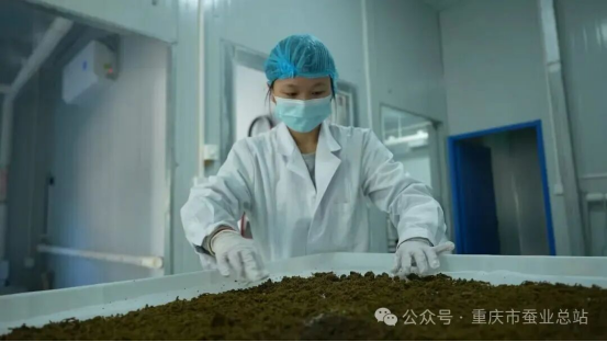 據(jù)重慶市蠶業(yè)總站蠶種管理科科長龍從明介紹,穩(wěn)定適宜的環(huán)境對小蠶至關(guān)重要,從收蟻到三齡期的10多天時間里,小蠶發(fā)育速度快,但抗病能力弱。桑蠶配合飼料小蠶共育技術(shù)通過智能化環(huán)境調(diào)控和標(biāo)準(zhǔn)化飼料配給,為小蠶創(chuàng)造了最佳生長條件,從根本上降低了病害風(fēng)險,大幅提升小蠶的存活率。目前,該基地正計劃推行“小蠶集中共育+農(nóng)戶分散飼養(yǎng)”模式,將小蠶在標(biāo)準(zhǔn)化車間內(nèi)統(tǒng)一飼養(yǎng)至三齡起蠶,再分發(fā)給農(nóng)戶,并統(tǒng)一調(diào)制飼料配送至農(nóng)戶家中,農(nóng)戶只需繼續(xù)飼養(yǎng)約10天,便可以收獲蠶繭,大幅降低了養(yǎng)殖難度。