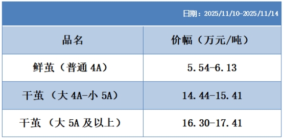 干繭價(jià)格指數(shù)方面,仍由全國鮮繭收烘與干繭貿(mào)易數(shù)據(jù)綜合構(gòu)成。其中,大 4A 至小5A干繭價(jià)格指數(shù)環(huán)比上周有所下滑,而大 5A 及以上干繭價(jià)格指數(shù)環(huán)比有所收紅,反映市場(chǎng)對(duì)高品質(zhì)干繭的需求仍相對(duì)穩(wěn)健。