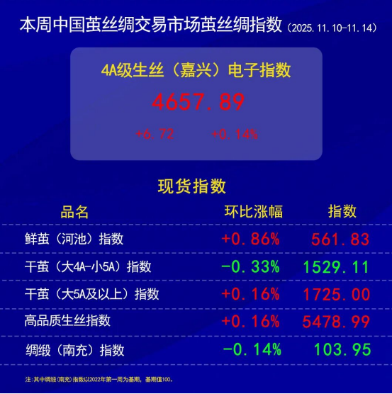 今日(周五)生絲盤面呈小幅收綠態(tài)勢(shì),全周整體維持小幅震蕩運(yùn)行格局。盡管周五收跌,但本周生絲電子指數(shù)仍小幅收紅,在秋繭上市末期,市場(chǎng)持續(xù)處于下有成本支撐、上有需求壓制的區(qū)間博弈格局,尋求方向指引。