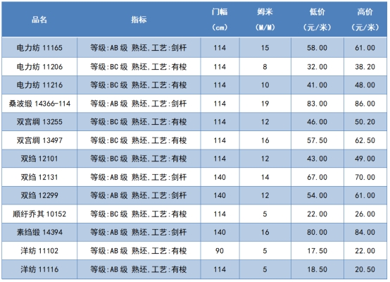 本周綢緞指數(shù)協(xié)作單位成交價(jià)格區(qū)間