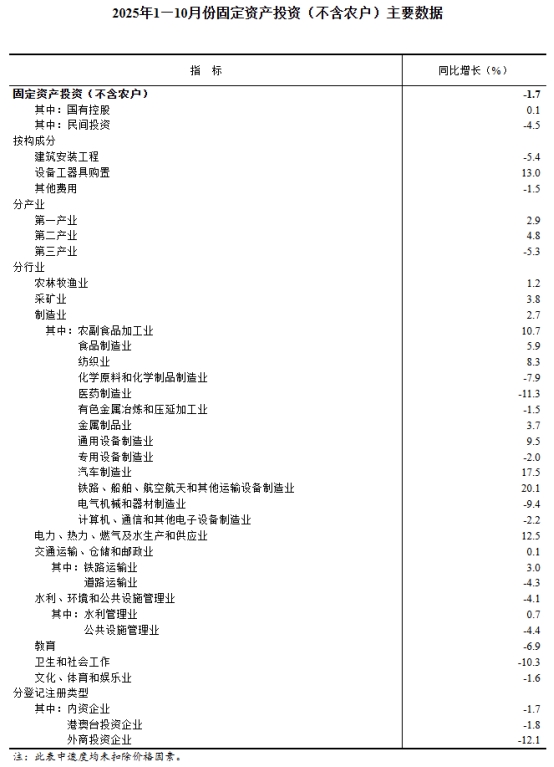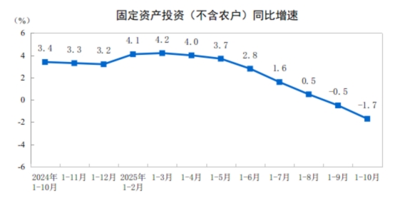 2025年1—10月份,全國固定資產投資(不含農戶)408914億元,同比下降1.7%(按可比口徑計算,詳見附注7)。其中,民間固定資產投資同比下降4.5%。從環(huán)比看,10月份固定資產投資(不含農戶)下降1.62%。