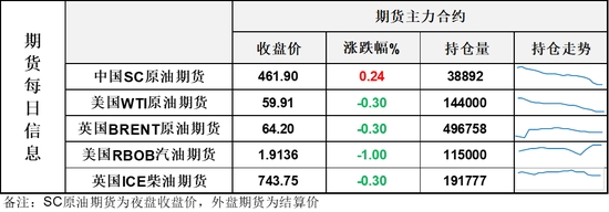 【1】WTI主力原油期貨收跌0.18美元,跌幅0.3%,報(bào)59.91美元/桶;布倫特主力原油期貨收跌0.19美元,跌幅0.3%,報(bào)64.2美元/桶;INE原油期貨收漲0.24%,報(bào)461.9元。