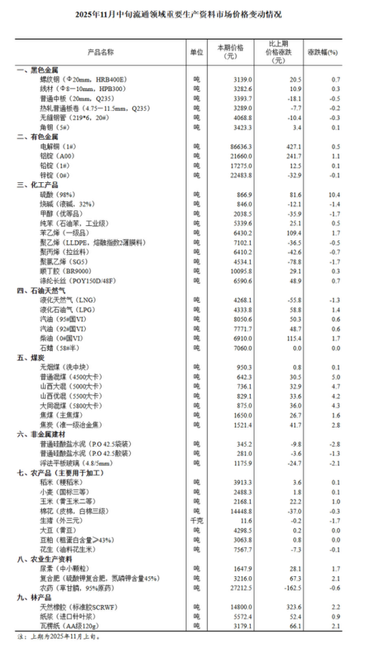國家統(tǒng)計局24日在官網(wǎng)公布2025年11月中旬流通領域重要生產(chǎn)資料市場價格變動情況。