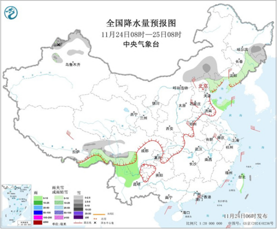 今天,內(nèi)蒙古東南部、東北地區(qū)雨雪范圍廣,同時,西藏、四川、云南等地仍有些雨雪天氣。具體來看,中央氣象臺預(yù)計,新疆北部、內(nèi)蒙古東部、東北地區(qū)東部、河北北部、西藏東部、川西高原北部等地部分地區(qū)有小到中雪或雨夾雪,局地有大雪。西藏東南部、山東半島、四川南部、云南中北部等地部分地區(qū)有小雨。