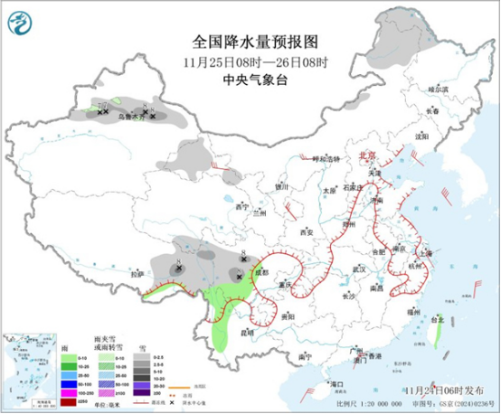 進入11月下旬,影響我國的冷空氣較為頻繁。目前,一股較強冷空氣正自西向東影響我國,今明天(11月24日至25日),冷空氣繼續(xù)東移南下,東北、華北東部到華南等地都將出現(xiàn)降溫。緊接著,25日至27日,又將有新一股冷空氣影響我國。此外,我國西南地區(qū)、東北等地雨雪天氣頻繁,局地或現(xiàn)大雪。