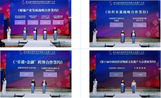 現(xiàn)場(chǎng),中國(guó)紡織工業(yè)聯(lián)合會(huì)非遺辦與成都紡織高等??茖W(xué)校、四川富潤(rùn)企業(yè)重組投資有限責(zé)任公司、四川安娜凱瑟莉服飾有限公司共同舉行“蜀錦產(chǎn)業(yè)發(fā)展戰(zhàn)略合作簽約”;中國(guó)紡聯(lián)非遺辦與北京時(shí)尚控股有限責(zé)任公司進(jìn)行“紡織非遺戰(zhàn)略合作簽約”;交通銀行成都東部新區(qū)支行與成都紡織高等??茖W(xué)校進(jìn)行“‘非遺+金融’跨界合作簽約”;值得一提的是,大會(huì)將于2026年迎來(lái)第十屆,現(xiàn)場(chǎng)舉行了中國(guó)紡織工業(yè)聯(lián)合會(huì)與東莞市大朗鎮(zhèn)“第十屆中國(guó)紡織非物質(zhì)文化遺產(chǎn)大會(huì)落址簽約”,將傳承的火炬繼續(xù)傳遞。一系列的簽約匯聚了國(guó)家級(jí)行業(yè)組織、專業(yè)高等院校、地方政府、金融機(jī)構(gòu)和實(shí)力企業(yè),標(biāo)志著紡織非遺從技藝研究、產(chǎn)品開(kāi)發(fā)到市場(chǎng)應(yīng)用的完整產(chǎn)業(yè)鏈條被成功打通,為非遺新生注入了強(qiáng)勁動(dòng)能。