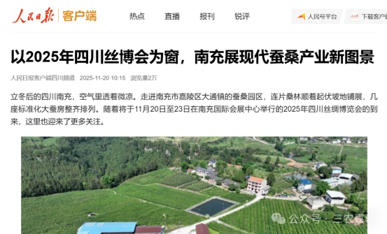 11月20日,《人民日報(bào)》刊發(fā)《以2025年四川絲博會(huì)為窗,南充展現(xiàn)代蠶桑產(chǎn)業(yè)新圖景》,多次提到嘉陵蠶桑產(chǎn)業(yè)發(fā)展場景,全文如下: