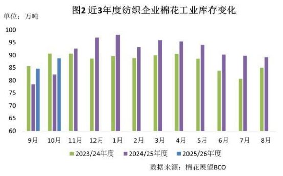 新棉大量上市,市場(chǎng)上可選資源增多,有補(bǔ)庫(kù)需求的紡紗企業(yè)開(kāi)始采購(gòu),原料庫(kù)存有所上升。截至10月底紡織企業(yè)在庫(kù)棉花工業(yè)庫(kù)存量為88.8萬(wàn)噸,較上月底增加4.3萬(wàn)噸。紡織企業(yè)可支配棉花庫(kù)存量為106.7萬(wàn)噸,較上月底增加3.4萬(wàn)噸。其中:38%的企業(yè)增加棉花庫(kù)存,16%減少,46%基本保持不變。盡管新棉供應(yīng)充足,但隨著下游即將進(jìn)入傳統(tǒng)淡季,企業(yè)補(bǔ)庫(kù)的持續(xù)性仍需觀察。