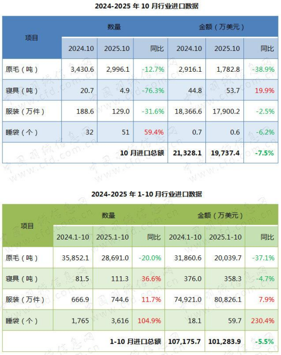 綜合1-10月,行業(yè)進(jìn)口總額約10.1億美元,同比下降5.5%。其中,原毛進(jìn)口量值齊跌,服裝進(jìn)口量值均有所上漲。