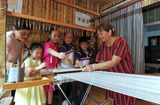 館長王一士(左一)和妻子計(jì)金妹(右一)在輯里湖絲博物館向小朋友講述手工緙絲技藝