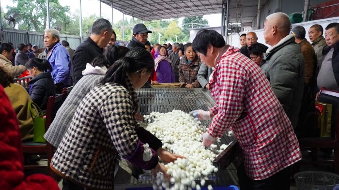 近日,威遠縣龍會鎮(zhèn)高灣村迎來今年最后一批桑蠶繭收購。收購點前,前來交售蠶繭的蠶農(nóng)絡(luò)繹不絕,收購商根據(jù)質(zhì)量進行定價、過秤、結(jié)算。