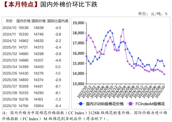 【本月特點(diǎn)】國(guó)內(nèi)外棉價(jià)環(huán)比下跌