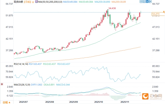 周四(11月27日)美盤時(shí)段,現(xiàn)貨白銀日內(nèi)價(jià)格呈現(xiàn)“先回落、后沖高再震蕩”的走勢(shì):亞市早盤小幅下探后,亞盤尾盤左右快速拉升至日內(nèi)高點(diǎn)53.9附近,隨后逐步回落并在53.2-53.3區(qū)間進(jìn)入橫盤震蕩。