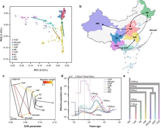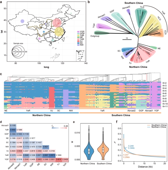 桑樹的起源在學(xué)界長(zhǎng)期存在爭(zhēng)議。為破解這一謎題,本研究對(duì)來(lái)自全球12個(gè)國(guó)家的376份桑樹種質(zhì)資源進(jìn)行了系統(tǒng)分析,其中包括39株具有數(shù)百乃至上千年樹齡的珍貴古桑樹。研究結(jié)果系統(tǒng)解析了桑樹起源、擴(kuò)散軌跡及南北群體遺傳分化規(guī)律,通過(guò)分子證據(jù)明確了云貴高原為桑樹起源中心。研究進(jìn)一步揭示,桑樹從起源地出發(fā),主要沿著"由南向北"的路線在中國(guó)境內(nèi)擴(kuò)散,這一遷徙過(guò)程導(dǎo)致了顯著的南北種群遺傳分化。值得關(guān)注的是,南方種群表現(xiàn)出更高的遺傳多樣性,這一發(fā)現(xiàn)為云貴高原作為桑樹起源中心提供了有力佐證(圖2、圖3)。