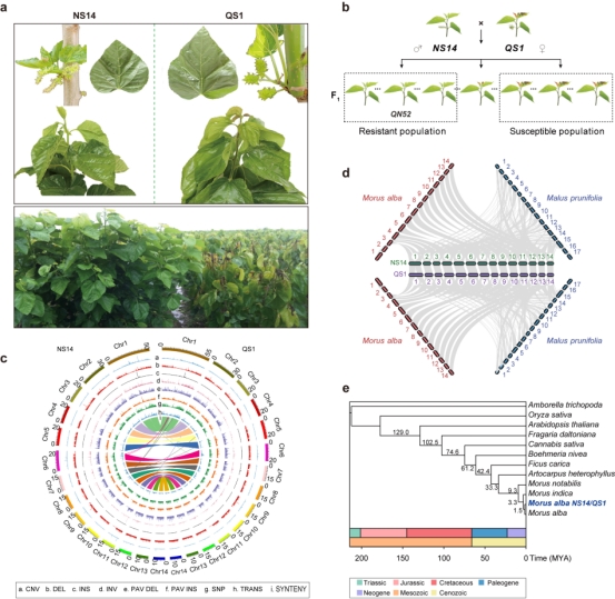 圖1 ‘農(nóng)桑14號(hào)’和‘強(qiáng)桑1號(hào)’的基因組及系統(tǒng)進(jìn)化信息