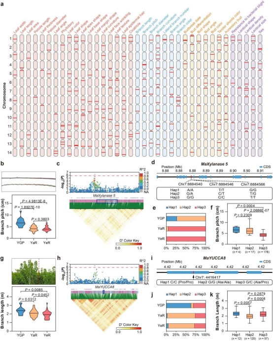 目前,桑樹性狀的遺傳解析多局限于少數(shù)類型,缺乏大規(guī)模系統(tǒng)性研究,嚴(yán)重制約了桑樹分子育種的進(jìn)程。為突破這一瓶頸,研究團(tuán)隊(duì)系統(tǒng)調(diào)查了37個(gè)與桑樹生長(zhǎng)發(fā)育及抗性相關(guān)的重要農(nóng)藝性狀,通過(guò)GWAS分析鑒定到了204個(gè)關(guān)鍵位點(diǎn),并對(duì)莖節(jié)長(zhǎng)度、株高、發(fā)芽時(shí)間、葉片大小、葉片厚度等關(guān)鍵生產(chǎn)性狀進(jìn)行單倍型解析,精準(zhǔn)鑒定調(diào)控性狀的相關(guān)基因,為桑樹分子設(shè)計(jì)育種奠定堅(jiān)實(shí)基礎(chǔ)。