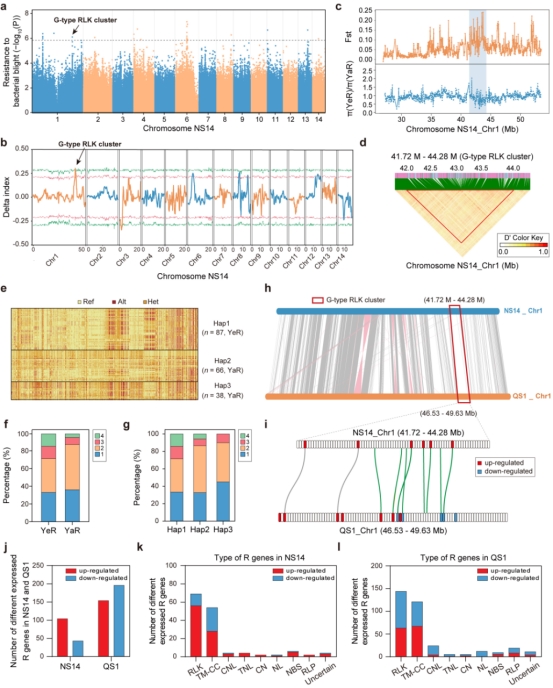 桑疫病是近年來(lái)危害桑產(chǎn)業(yè)的主要細(xì)菌性病害,對(duì)產(chǎn)業(yè)造成了極大經(jīng)濟(jì)損失。為解析桑樹的桑疫病抗性機(jī)制,團(tuán)隊(duì)歷時(shí)五年構(gòu)建了強(qiáng)抗病品種‘農(nóng)桑14號(hào)’與易感病品種‘強(qiáng)桑1號(hào)’的子代分離群體,對(duì)子代538個(gè)群體進(jìn)行連續(xù)3年的抗病性調(diào)查,通過(guò)BSA+GWAS策略,首次發(fā)現(xiàn)位于1號(hào)染色體的G-type RLK串聯(lián)超級(jí)基因簇在桑樹疫病抗性中的關(guān)鍵作用,揭示了桑樹抗病性的核心遺傳基礎(chǔ),為桑樹抗病分子育種提供了關(guān)鍵靶點(diǎn)與理論依據(jù)(圖5)。