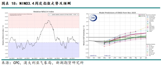 當(dāng)前全球氣候有弱拉尼娜跡象,NINO3.4周度指數(shù)截止11月23日已經(jīng)跌至-0.93。美國(guó)氣候預(yù)測(cè)中心(CPC)預(yù)估,弱拉尼娜現(xiàn)象將持續(xù)至北半球冬季,有可能2026年1月至3月過(guò)渡為ENSO中性狀態(tài)(61%概率)。